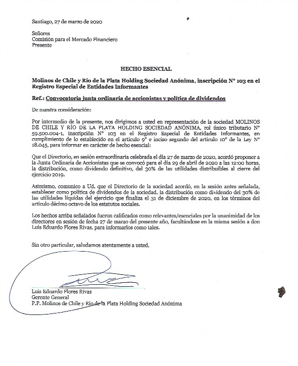 Por intermedio de la presente, nos dirgimos a usted en representacion de la sociedad MOLINOS